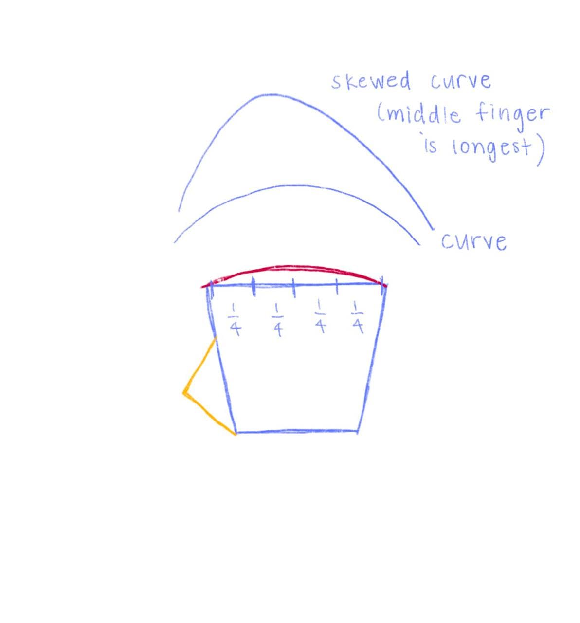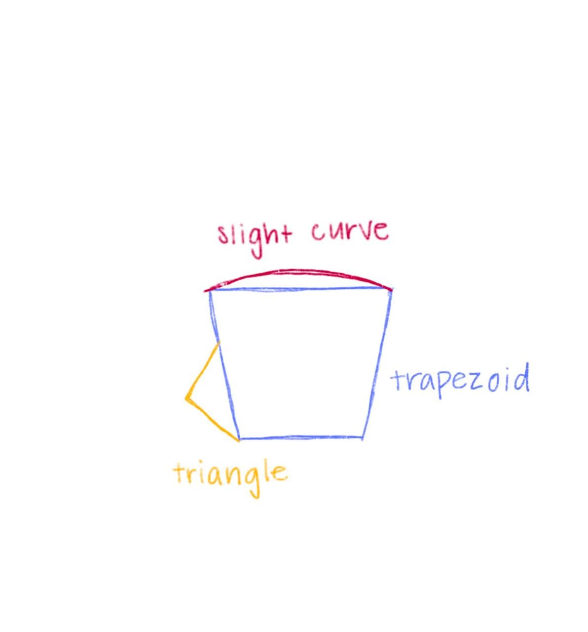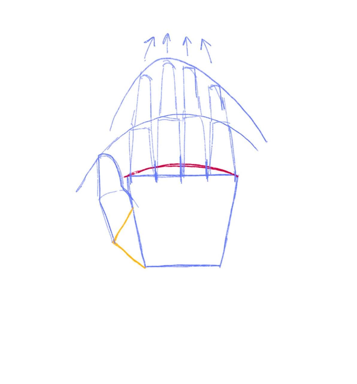 For the palm of the hand, first draw a trapezoid and a thin curve on the top. Then, draw a wide triangle on the side of the trapezoid.