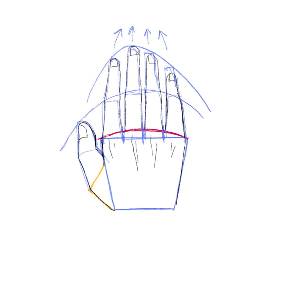 The joints of the fingers do not line up in a straight line; draw a curve for the first set of joints, then a skewed curve for the tips of the fingers